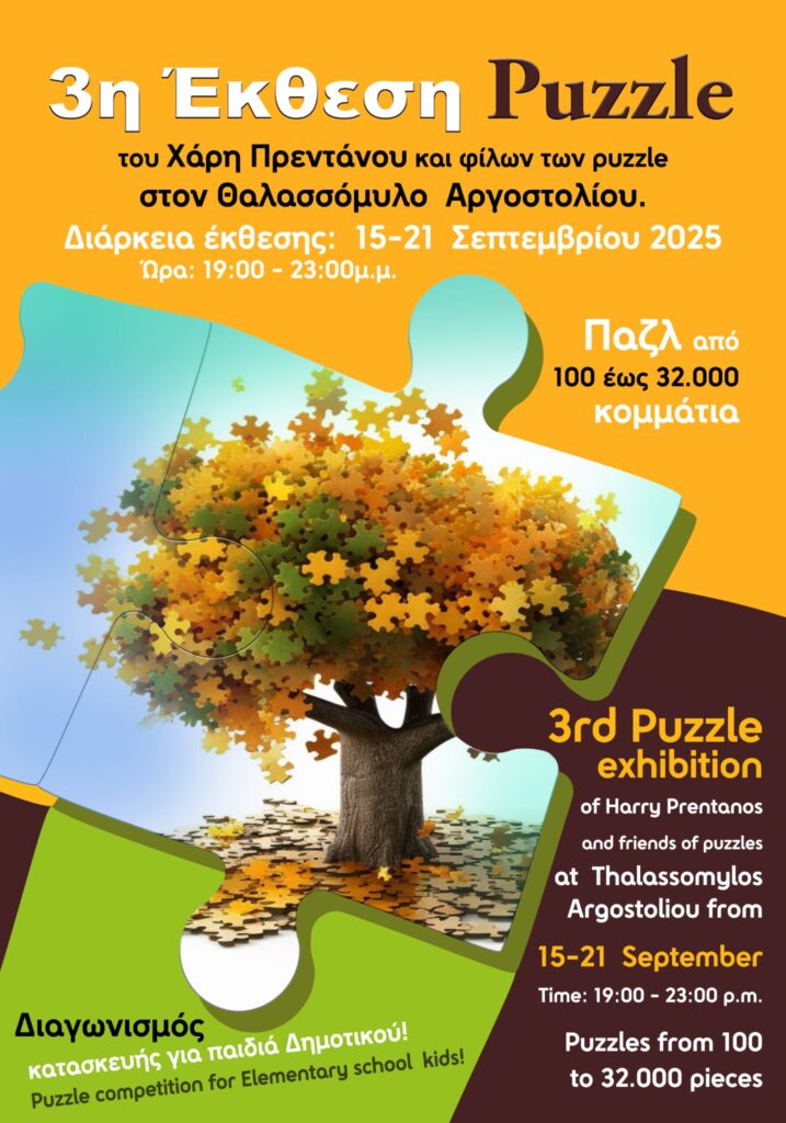 Από την Δευτέρα 15/09 εως και την Κυριακή 21/09 και ώρες 20 00 με 23 00 το βράδυ θα γίνει έκθεση με πάζλ στον χώρο του Θαλασσόμυλου στο Αργοστόλι. Θα εκτεθούν διαφόρων θεμάτων παζλ, δικά μου αλλά και φίλων/συγγενών από 100 εως 32.000 κομμάτια! Θα έχει επίσης διαγωνισμό γρηγορότερης κατασκευής παζλ με 100 κομμάτια για παιδιά Δημοτικού, με δώρο ένα παζλ της αρεσκείας των νικητών.
